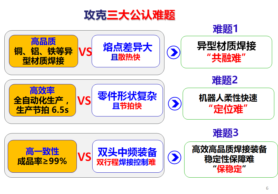 “异型材质高效双头中频焊接全自动成套加工设备”项目攻克了三大行业公认难点:异型材质焊接“共融难”、机器人柔性快速“定位难”和高效高品质焊接装备稳定性保障难“保稳定”。