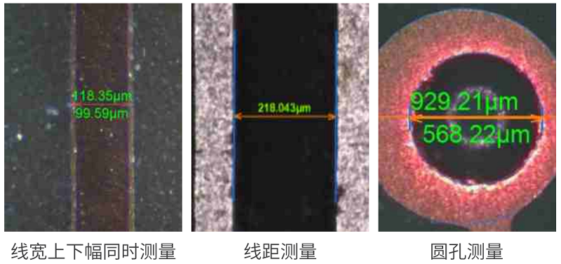 通过影像成像系统及光源从上表面垂直于被测板,呈显影像(相机实时拍图)感测,并将图像传送至电脑测量软件,通过软件测量工具分析图像的“线宽/线距/线宽上下幅/圆/金手指线宽等”标准公差值对比,从而判断被测板上的测量值OK或NG。