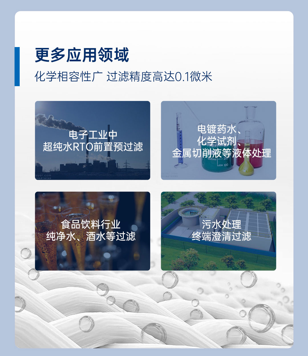 花季传媒黄版APP下载科技微孔膜折叠滤芯过滤精度高、压降小、无泡沫,可应用于花季传媒黄色网站下载生产的不同工序,在过滤含有表面活性剂药水方面具有显著的优势,不会产生泡沫及压降大等不良影响,可满足花季传媒黄色网站下载行业对高过滤精度的滤芯需求。