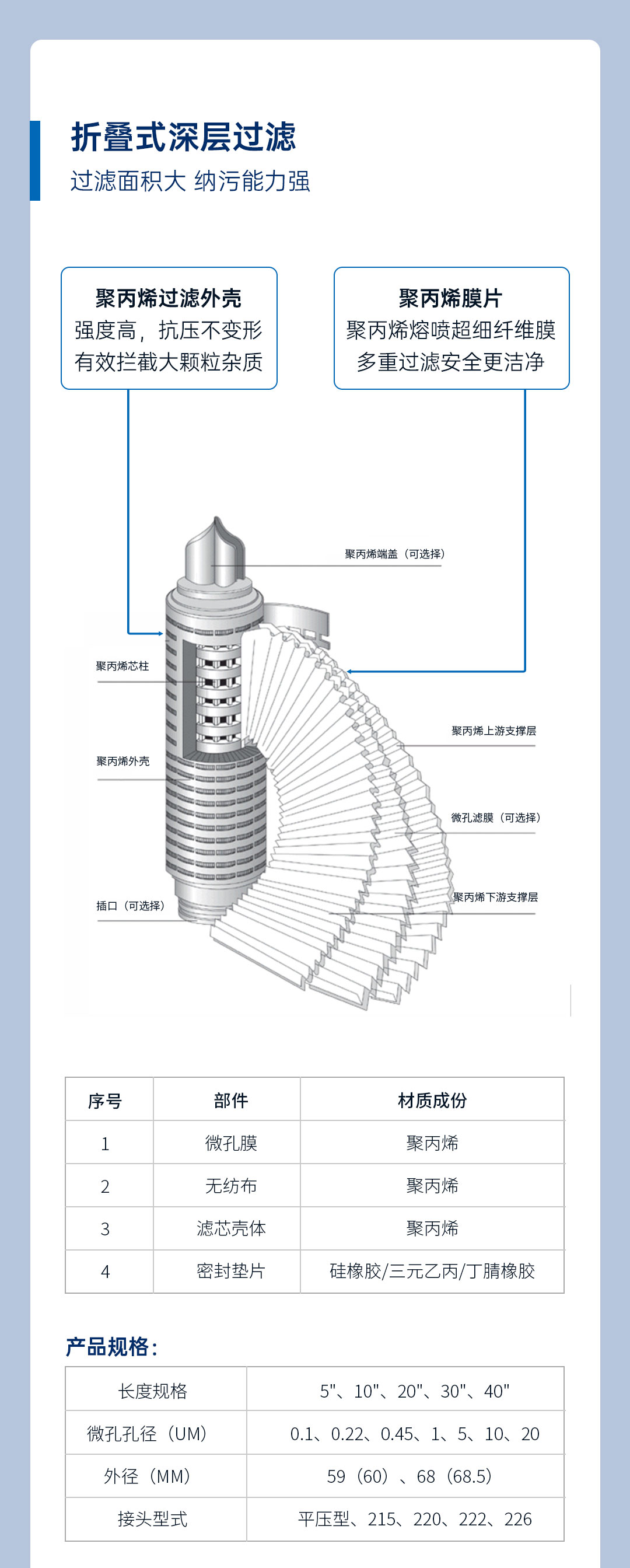 作为高过滤精度滤芯的折叠滤芯,在材质上主要精选聚丙烯(PP)高分子微孔过滤膜材料,耐酸耐碱等化学相容性好;在生产工艺上,采用独特的热熔焊接加工技术,采用100%全新PP注塑成型塑料壳体,无任何粘合剂,无异物释出。